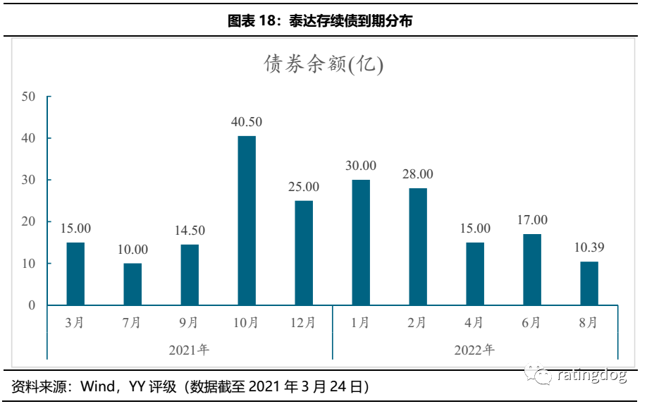 僅從泰達(dá)控股公開市場發(fā)債來看,截至21年3月24日,存續(xù)債券14只,債券余額205.39億元,均在2021-2022年到期(考慮行權(quán)),其中2021年將到期105億,占比過半。