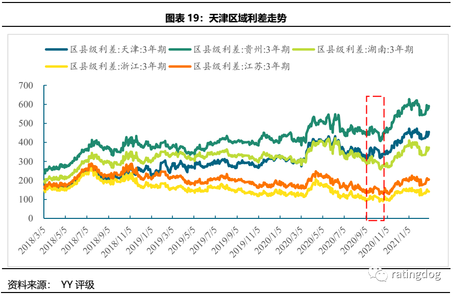 自2020年9月,天津市邀請轄內(nèi)多家金融機(jī)構(gòu)參與座談會,討論如何支持泰達(dá)控股以來,泰達(dá)債務(wù)問題引起市場廣泛關(guān)注,估值壓力開始顯現(xiàn),出現(xiàn)了90元以下折價(jià)成交。從天津區(qū)縣級利差走勢來看,20年9月天津區(qū)縣級城投利差在其他區(qū)域緩慢下行時(shí)繼續(xù)走高,同期天津區(qū)縣級利差開始顯著高于湖南區(qū)縣級利差,并不斷走闊。