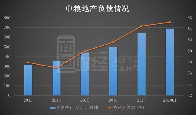 中糧地產的負債總額從2013年末的316.32億元增至2018年一季度末的686.87億元,增加了370億,增幅為117%。同期資產負債率從77.91%攀升至85.21%,2015年至今已連續3年增長。