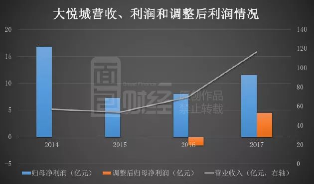 從上圖可以看到,經調整后,大悅城2016年的歸母凈利潤為虧損1.54億元,2017年則為盈利4.5億元,較調整前歸母凈利潤減少了近六成。