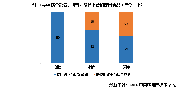 目前房企的新媒體矩陣已經(jīng)覆蓋包括微信、抖音、知乎等眾多平臺(tái),僅從微信公眾號(hào)、微博和抖音三個(gè)平臺(tái)的使用情況看,根據(jù)CRIC統(tǒng)計(jì),截止日前超五成TOP50房企同時(shí)使用三個(gè)平臺(tái),但僅部分房企保持較高的活躍度,房企媒體矩陣仍有較大發(fā)展空間。