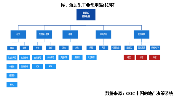 從CRIC監(jiān)測(cè)情況來(lái)看,目前雅居樂(lè)的媒體矩陣中,橫向矩陣基本覆蓋了各年齡段經(jīng)常使用的平臺(tái),在社交、短視頻、直播、綜合資訊等平臺(tái)均有布局,由于雅居樂(lè)跨界綜藝的創(chuàng)新營(yíng)銷方式,因此媒體矩陣中還包括鮮有房企進(jìn)駐的在線視頻平臺(tái),這也是雅居樂(lè)媒體矩陣的特色之一;縱向矩陣中微信布局較為全面,處于行業(yè)內(nèi)中等偏上水平。