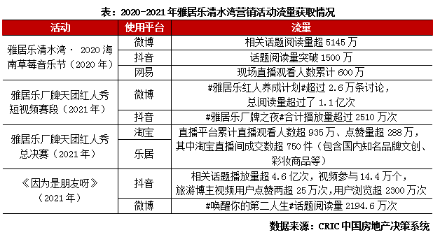 2020年初,雅居樂(lè)計(jì)劃舉辦第八屆國(guó)際沙灘啤酒狂歡節(jié),原希望以“國(guó)潮+英倫+啤酒”的形式讓業(yè)主感受不一樣的新年氛圍,后期由于疫情未能舉辦,但雅居樂(lè)的造勢(shì)積極性并未受到打擊。同年11月,超6萬(wàn)名樂(lè)迷齊聚清水灣,雅居樂(lè)清水灣·2020海南草莓音樂(lè)節(jié)開啟全網(wǎng)超2億次的平臺(tái)傳播浪潮。2021年雅居樂(lè)乘勝追擊,通過(guò)雅居樂(lè)廠牌天團(tuán)紅人秀選出“清水灣隊(duì)”,進(jìn)入“樂(lè)居廠牌之夜終極大秀”,海南清水灣品牌獲得持續(xù)推廣。廠牌天團(tuán)紅人秀是“地產(chǎn)圈+娛樂(lè)圈+直播圈”的勇敢嘗試。2021年12月,雅居樂(lè)聯(lián)合英皇娛樂(lè)制作房產(chǎn)行業(yè)內(nèi)首個(gè)綜藝跨界的節(jié)目——《因?yàn)槭桥笥蜒健罚ㄟ^(guò)與眾多平臺(tái)深度內(nèi)容合作,持續(xù)推廣清水灣項(xiàng)目,同時(shí)開通抖音小店和“沉浸式”直播,推出明星同款海島游和購(gòu)房折扣券,實(shí)現(xiàn)邊看邊買的線上線下聯(lián)動(dòng)的營(yíng)銷閉環(huán)。