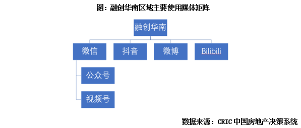 融創(chuàng)華南區(qū)域來(lái)看,基于數(shù)字化營(yíng)銷數(shù)據(jù)沉淀,融創(chuàng)華南區(qū)域積極構(gòu)建新媒體矩陣,對(duì)抖音、微信等產(chǎn)品進(jìn)行數(shù)據(jù)打通,線上營(yíng)銷形成閉環(huán)。首先是搭建媒體矩陣:融創(chuàng)華南區(qū)域利用三大新媒體平臺(tái)實(shí)現(xiàn)四條流量入口,即微信公眾號(hào)、微信視頻號(hào)、抖音和微博,另外融創(chuàng)華南也開設(shè)B站,面向年輕人主打微綜藝。