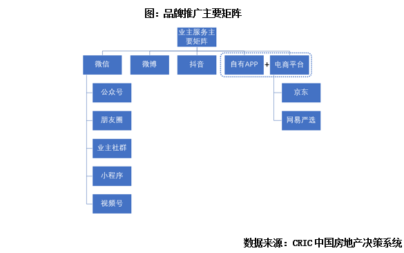 從目前地產(chǎn)企業(yè)的營(yíng)銷行為來(lái)看,橫向矩陣用的比較多的新媒體平臺(tái)主要集中在社交軟件和短視頻直播平臺(tái)兩種。社交軟件方面,由于微信的私人和工作雙重社交屬性加上企業(yè)微信的普及,房企多開設(shè)微信公眾號(hào)、服務(wù)號(hào)等進(jìn)行內(nèi)容營(yíng)銷,且通過(guò)小程序?qū)崿F(xiàn)線上看房。也有不少房企在微博上開設(shè)藍(lán)V賬號(hào),多渠道觸達(dá)、加強(qiáng)與業(yè)主的互動(dòng)等,增加曝光度打造品牌口碑。但由于目前微博流量較為分散,加上作為開放平臺(tái),客戶抱怨評(píng)論等負(fù)面效應(yīng)較多,不少房企微博更新頻次低或者已經(jīng)棄用。直播平臺(tái)方面,主要是抖音、快手等發(fā)布小視頻和直播營(yíng)銷,淘寶直播進(jìn)行互動(dòng)及房產(chǎn)推介。此外由于微信前期的客戶積累,獲客成本減少,不少企業(yè)也開設(shè)微信視頻號(hào)進(jìn)行小視頻及直播互動(dòng)。此外,有部分房企根據(jù)自身情況,搭建品牌APP來(lái)進(jìn)行服務(wù)與宣傳。