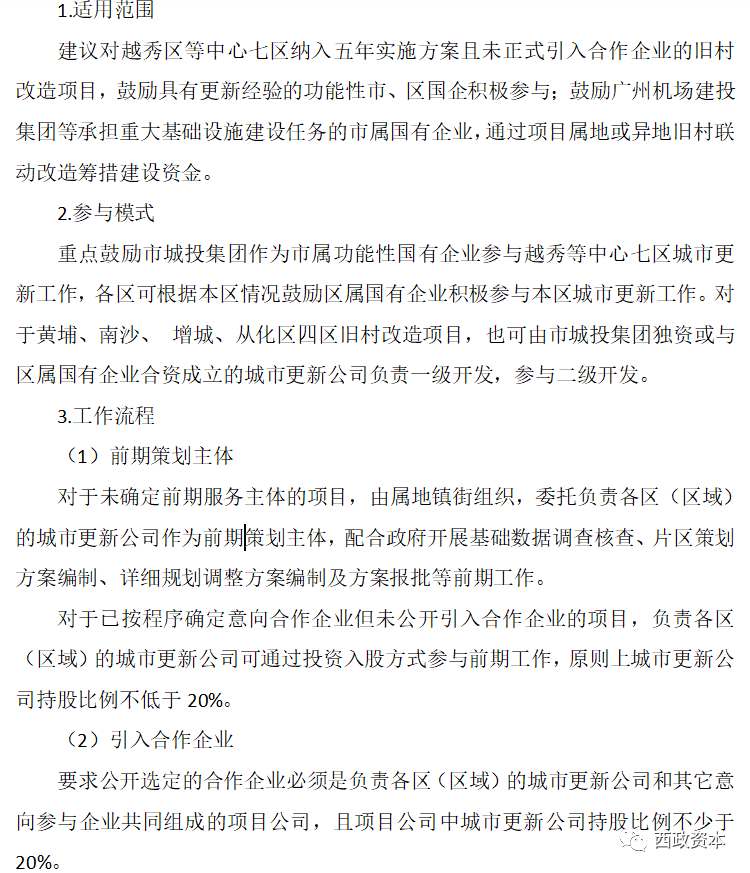 自8月10日發布上述《通知》的征求意見稿后,廣州市住建局《關于審議鼓勵功能性國企參與城市更新改造項目有關工作的請示》在各大媒體流傳開來,其中文件中提到的“重點鼓勵市城投集團作為市屬功能性國有企業參與越秀等中心七區城市更新工作”一度讓市場認為城市更新將全面進入國企主導的時代。