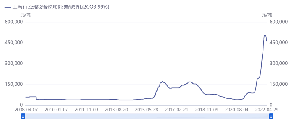 根據上海有色報價,碳酸鋰自4月7日創下502,500元/噸的價格后,連續回落突破500,000元/噸關口,4月14日報價495,000元/噸,4月28日報價已跌至461,500元/噸。