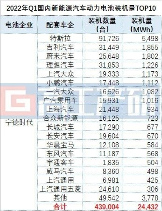 據高工產業研究院(GGII)統計:2022第一季度,動力電池裝機量約46.87GWh,同比增長140%。具體來看,仍舊是一超多強的競爭局面,寧德時代裝機量高達24.43GWh,市占率超過50%。