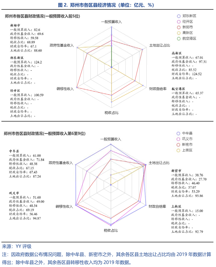 截至7月中旬,因鄭州市仍有多個區縣尚未披露最新的財政預決算報告,2020年的財政數據缺失較多,可見鄭州區域的數據披露的及時性和完整性都比較吊車尾。從已有數據來看,鄭州各區中,鄭東新區和經開區的財政實力最強,為鄭州市2020年一般預算收入超100億元的唯二區域,但缺乏更多維度的財政數據。此外,一般預算收入排名第五的航空港區同樣缺乏更多的財政數據。