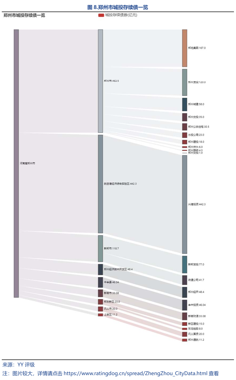 截至2021年7月8日,鄭州市的發債平臺主要分布在地市級、功能區和郊縣,平臺存續債合計規模超1,200億元。市級平臺債務主要集中在鄭地集團和鄭州發投,分別占全部市級城投存續債的36.1%和25.9%;從各區看,航空港經濟綜合實驗區城投存續債規模最大,存續債券余額有442.3億元,且均屬于興港投資的債務。排第二位的為新鄭市,債務集中在新鄭發投和政通公司。