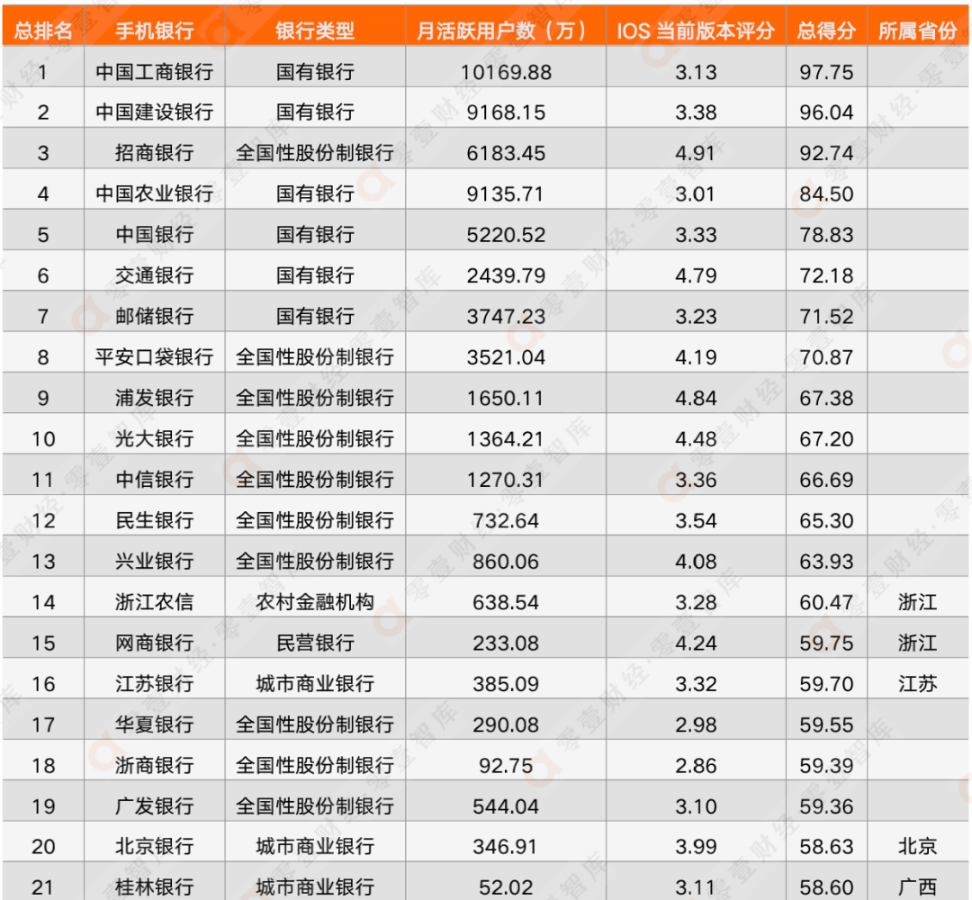 零壹智庫根據(jù)我國銀行業(yè)的劃分類型,得出下述有關手機銀行競爭格局的研究結論: