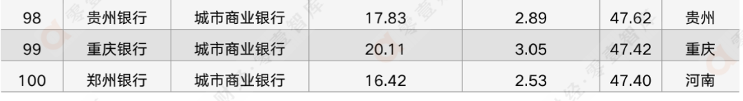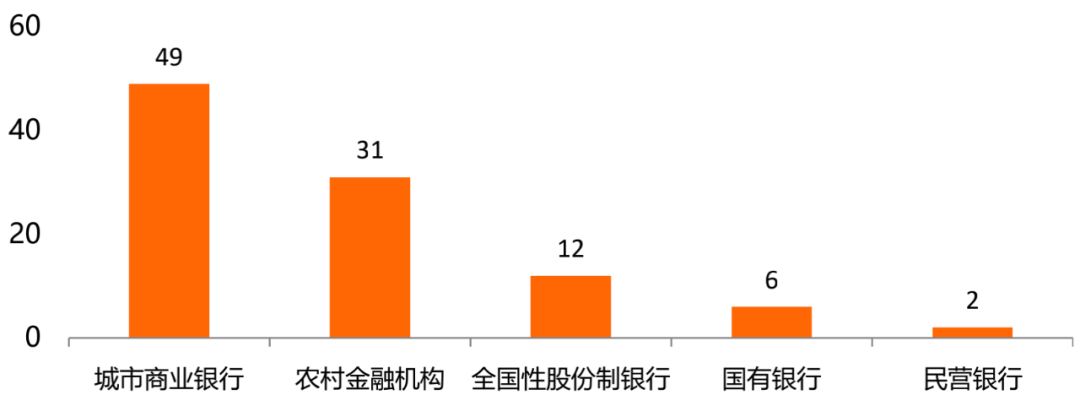 從所屬機構類型來看,在本次入選的100家銀行之中,城市商業(yè)銀行占比最高,達49%;其次為農(nóng)村金融機構,占比31%;全國性股份制銀行、國有銀行、民營銀行占比分別為12%、6%、2%。
