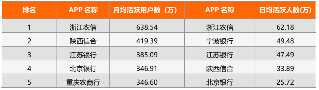 此外,江蘇銀行在中小銀行之中,2項指標的排名保持不變,均位列第3名。月均月活躍用戶數(shù)和月均日活躍人數(shù)的第五名分別是重慶農(nóng)商行346.60萬、北京銀行25.72萬,遠高于2個維度的平均值,中小銀行頭部App正在加速趕超國有大行與全國性股份制銀行的生態(tài)平臺建設進程。