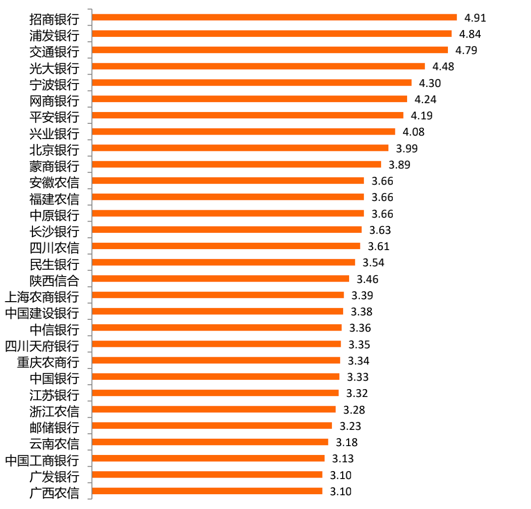 (一)排名綜述:浙江農(nóng)信、江蘇銀行保持領先,浦發(fā)銀行入選前十名