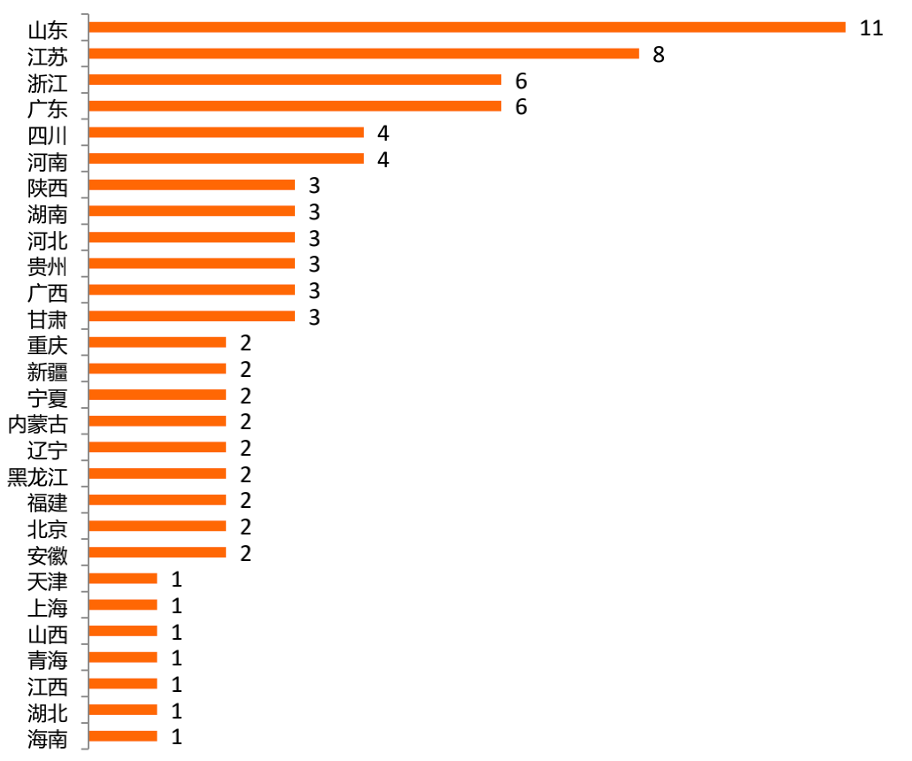 從中小銀行的排名順序來看,浙江農(nóng)信位列農(nóng)村金融機構第一,總排名為第14位;江蘇銀行位列城商行第一,總排名為第16位。零壹智庫研究發(fā)現(xiàn),從入選中小銀行的所屬省份來看,山東省的入選數(shù)量最多,合計機構數(shù)量為11家。