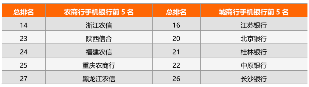 相較于全國性銀行,一批中小商業(yè)銀行的用戶數(shù)量增速更為顯著,表現(xiàn)出逐步趕超部分全國性股份制銀行的發(fā)展趨勢。身處后疫情時代,多數(shù)中小銀行已經(jīng)陷入“數(shù)字化轉型如何做的焦慮迷茫之中”,因此亟需通過手機銀行來實現(xiàn)重塑數(shù)字基因。結合2021年3季度的手機銀行TOP 100名單,零壹智庫分別選取了城商行、農(nóng)村金融機構各自排名前5位,綜合各項指標來看,除了浙江農(nóng)信之外,城市商業(yè)銀行手機銀行App的整體排名高于農(nóng)村金融機構。