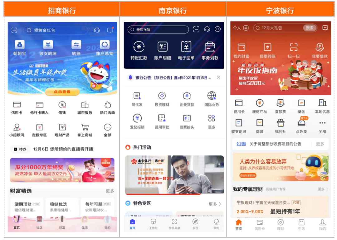 整體來看,商業(yè)銀行移動端的平臺建設,主要包括手機銀行App、微信公眾號/小程序、網(wǎng)上銀行以及電話銀行等4類渠道。其中,手機銀行App是獲取線上流量最主要的端口,下面展示了3家典型的手機銀行App首頁布局情況。其中,寧波銀行作為城商行之中的特色標桿,在財富開放平臺、場景布局方面具備獨特性,App評分名次靠前。下文將圍繞寧波銀行的手機銀行建設運營情況,進行全景化展示。