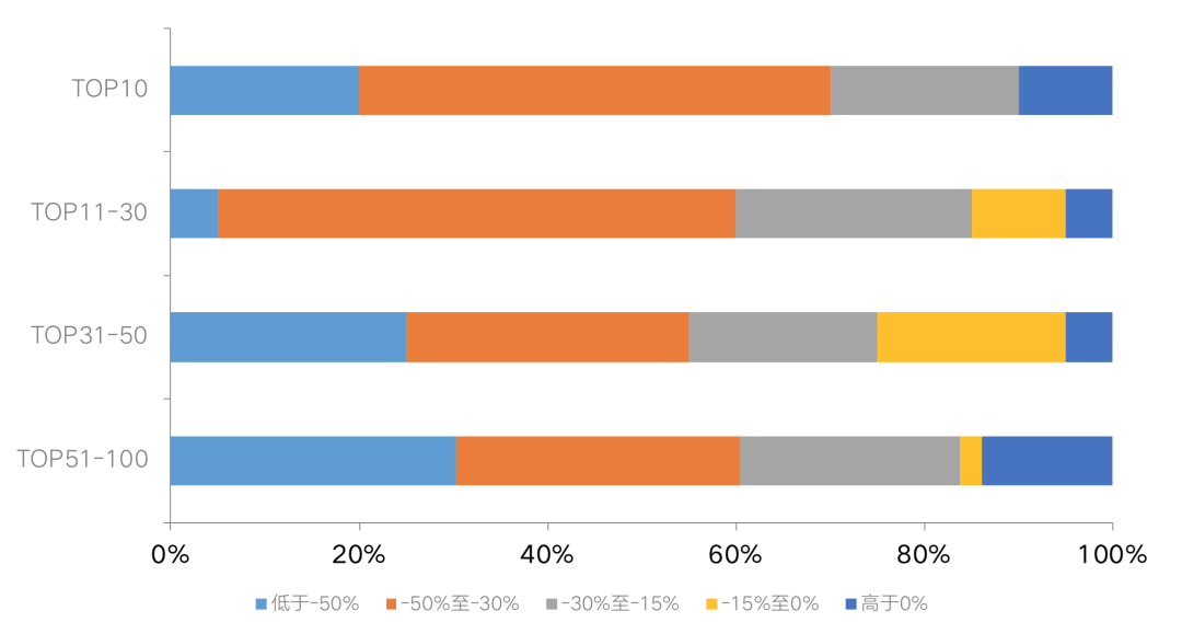 隨著去年同期銷售恢復、業績同比基數回升,今年二季度以來百強房企單月業績增速呈明顯放緩趨勢。此外,下半年以來受市場整體降溫的影響,百強房企業績表現不及上半年和去年同期。