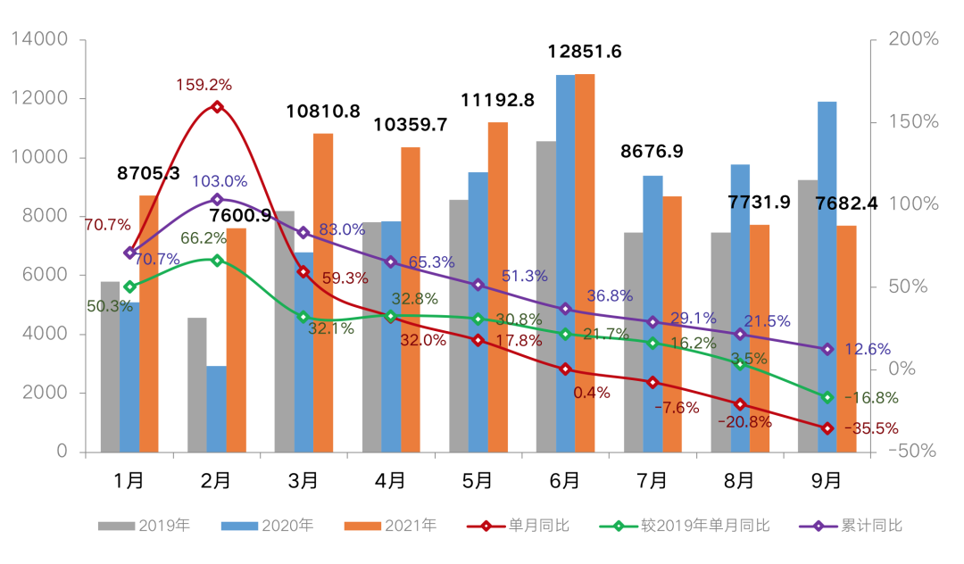 圖:2021年1-9月百強房企單月操盤業績表現及同比變動(億元)