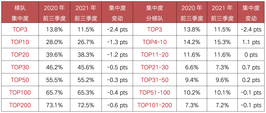 表:2021年前三季度TOP200各梯隊房企銷售操盤金額集中度