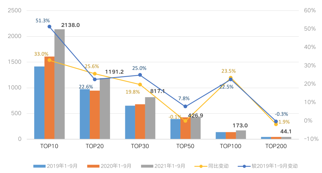 注:操盤金額集中度=入榜房企操盤銷售金額/統計局公布的全國商品房銷售金額;其中,2021年前三季度全國商品房銷售金額是根據前8月累計同比增幅推算9月同比增幅所得。