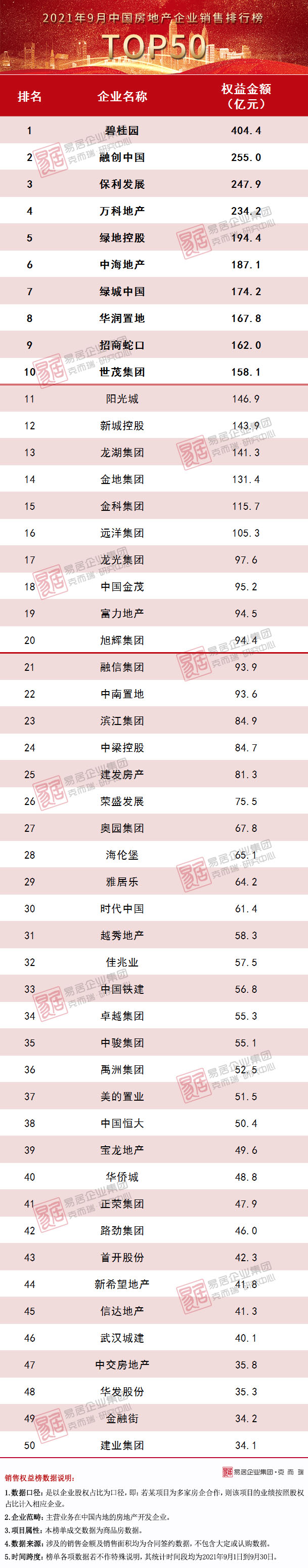 9月房企單月業績表現不及上半年及歷史同期,逾半數百強房企同環比雙降。值得注意的是,在全口徑TOP50中有21家房企9月單月業績環比上升,其中陽光城9月單月銷售業績209.9億元,是唯一一家同環比雙增的企業。