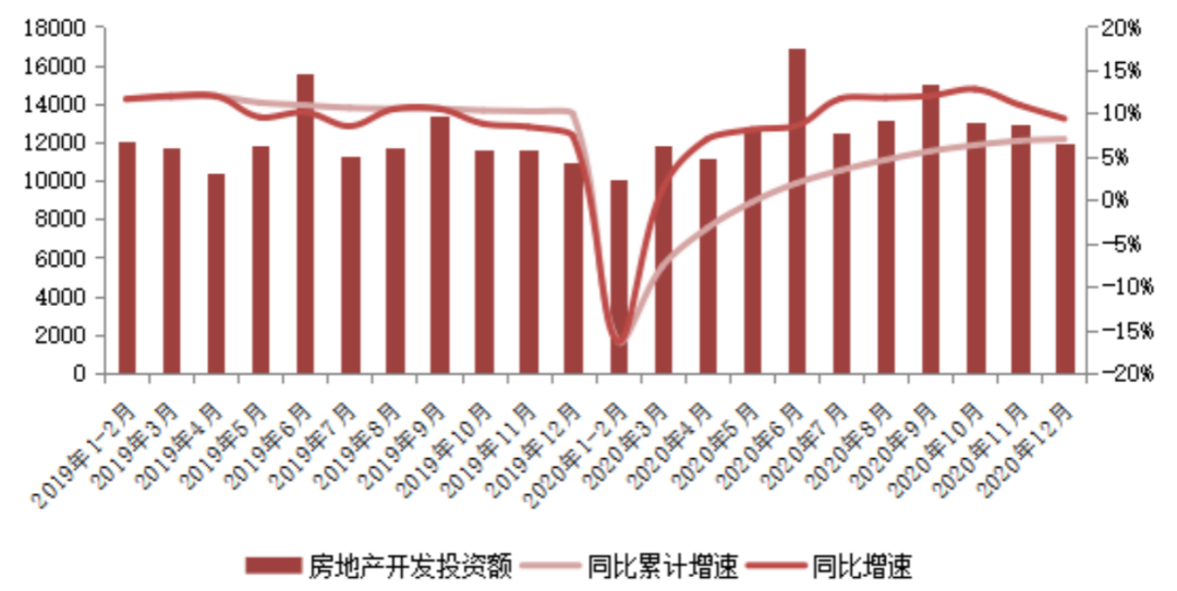國(guó)家統(tǒng)計(jì)局?jǐn)?shù)據(jù)顯示:2020年,全國(guó)房地產(chǎn)開(kāi)發(fā)投資額141443億元,同比增長(zhǎng)7%。單月開(kāi)發(fā)投資規(guī)模的收窄使得全年累計(jì)規(guī)模增速出現(xiàn)“降速”,前12月僅較前10月漲幅僅提高0.7pts。