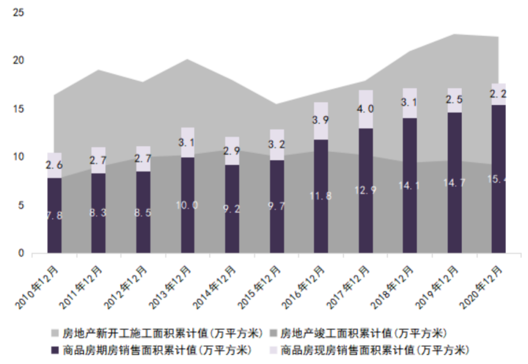 2020年房屋施工面積累計(jì)達(dá)926759萬(wàn)平方米,已超過(guò)2018年與2019年年底規(guī)模,同比增長(zhǎng)3.7%。由于竣工節(jié)點(diǎn)的即將到來(lái),2020年房屋施工面積維持在歷史高點(diǎn)。