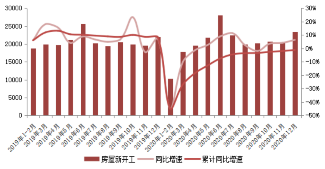 2020年房企房屋新開(kāi)工面積在“三條紅線”出臺(tái)后便相應(yīng)止升回落。下半年新房市場(chǎng)銷售表現(xiàn)不及預(yù)期使得房企對(duì)未來(lái)預(yù)期看淡。同時(shí)融資收緊下房企資金問(wèn)題短期內(nèi)難以發(fā)生根本轉(zhuǎn)變,房企對(duì)開(kāi)工進(jìn)度與施工強(qiáng)度的抉擇將受到持續(xù)影響。由于2020年房企土地購(gòu)置面積依舊呈負(fù)增長(zhǎng),因此預(yù)計(jì)2021年可待開(kāi)發(fā)土地規(guī)模有限,將拖累新開(kāi)工指標(biāo),2021年新開(kāi)工面積規(guī)模將繼續(xù)低位,但相比于2020年同比有望正增長(zhǎng),主要由于2020年規(guī)模較低且負(fù)增長(zhǎng),前值較低。