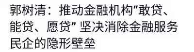 前天,郭樹清提出對民營企業貸款要實現“一二五”目標,即在新增的公司類貸款中,大型銀行對民營企業的貸款不低于1/3,中小型銀行不低于2/3,爭取3年以后,銀行業對民營企業的貸款占新增公司類貸款的比例不低于50%。