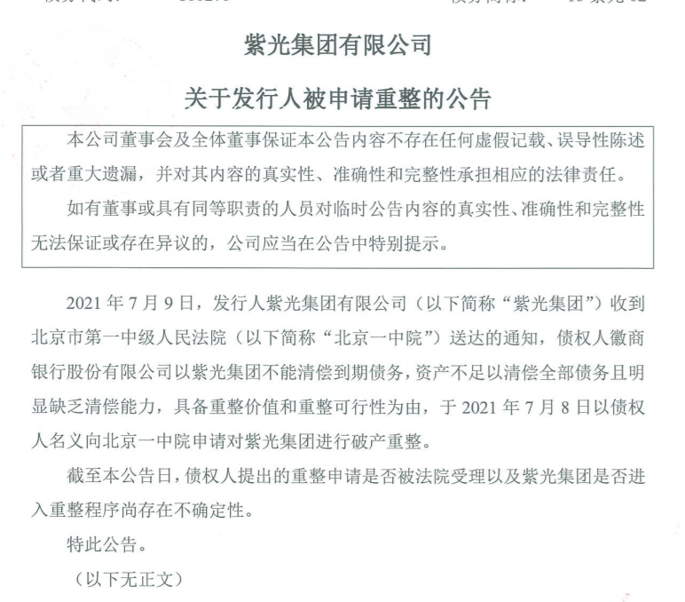 1、紫光集團(tuán)公告,被債權(quán)人徽商銀行申請(qǐng)破產(chǎn)重整。經(jīng)過(guò)違約之前的掙扎(各地政府都忽悠了一遍),違約后的自救(傳移動(dòng)、阿里之類(lèi)要重組他),都以失敗告終,看來(lái)只能清算了。這段時(shí)間紫光的成交價(jià)30+,不知道破產(chǎn)清算的回收率如何,看著夠嗆。