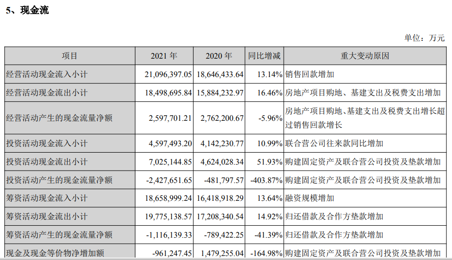 同時,投資活動產生的現金流量凈額為-242.77億元,2020年為-48.18億元,下滑403.87%年,年報解釋說購建固定資產及聯合營公司投資及墊款增加。