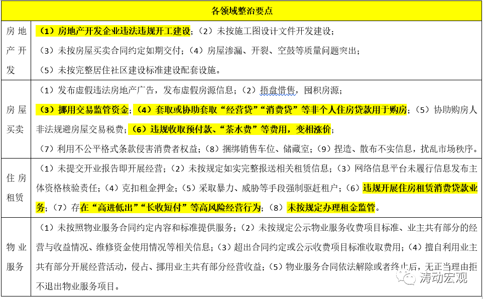 (二)因城施策突出整治重點,在上述四大領(lǐng)域抓整治要點,如嚴查地產(chǎn)開始企業(yè)違法違規(guī)開工建設(shè)、延期交付、房屋質(zhì)量問題、捂盤惜售、挪用交易監(jiān)管資金、違規(guī)收取預(yù)付款和茶水費等費用、違規(guī)開展住房租賃消費貸款業(yè)務(wù)、未按規(guī)定辦理租金監(jiān)管和資金歸集等。