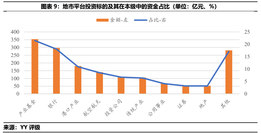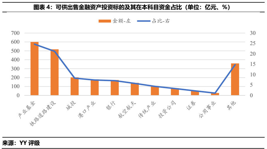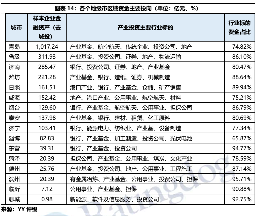 綜合來說,除去城投類投資,山東城投產業化的方向多為產業基金(主要投資標的為信息技術、汽車和醫藥行業)、銀行(約88.10%投向本土銀行)、地產、投資公司、港口產業、航空航天。