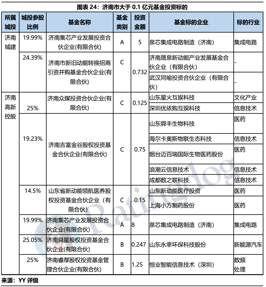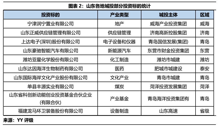產業投資于城投而言在一定程度上體現了風險加成,就山東而言,資源稟賦的不同也代表著產業化的方式以及投資標的的差異。資本較為充足的地區例如青島、濟南等地可通過收并購方式引入外省企業,下沉地區聚焦省內,助力地方龍頭企業的運營,但最終城投能否降低債務壓力、實現穩定盈利仍需要時間的檢驗。