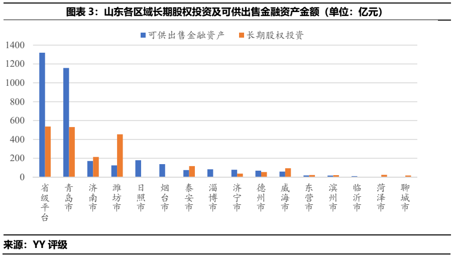 為探究山東城投產業化的方向,本文選取截至2020年末山東城投中可供金融資產或長期股權投資科目大于10億的企業,就上述兩科目進行拆分,觀察各區域城投的產業投向。