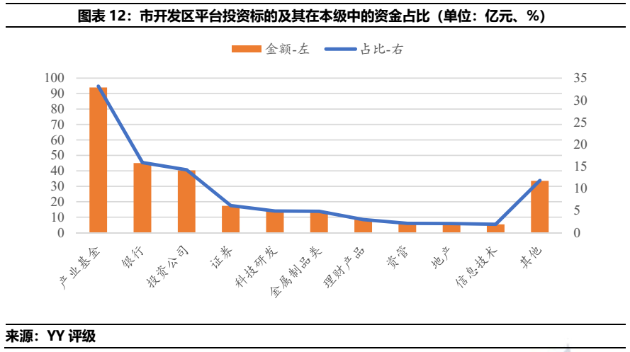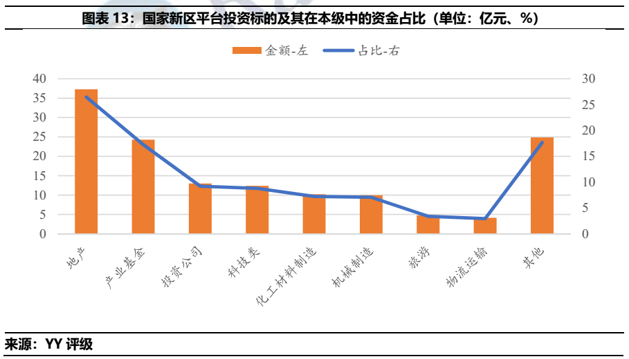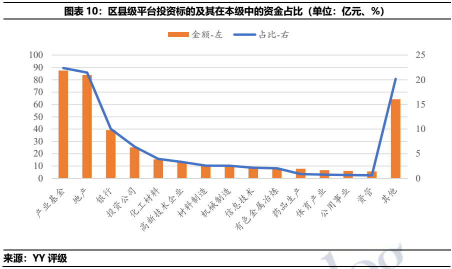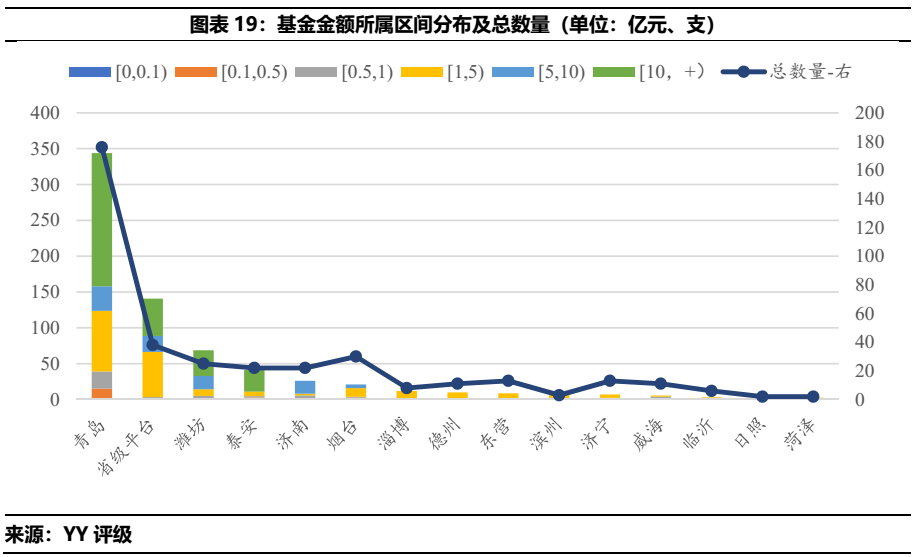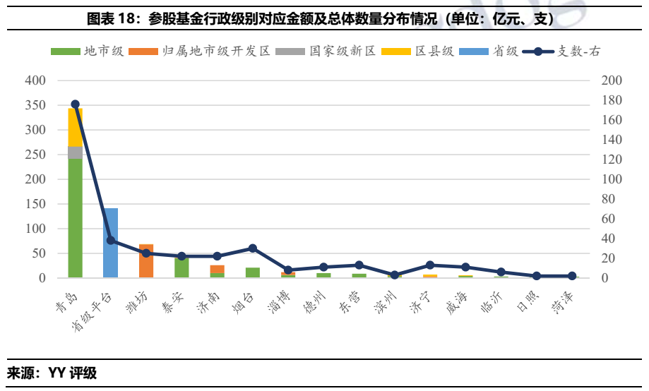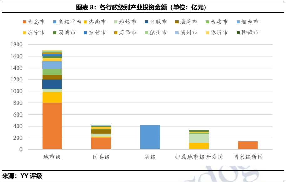 總體來看,山東城投偏好于產業基金、銀行、投資類公司的投資,上述標的投資分別占去城投類投資總額的25.52%、13.29%和9.33%。分行政區域劃分來看,僅有國家級開發區投資最多為地產行業,其余皆為產業基金。分地市級來看,產業基金投資占比第一的區域分別為青島、省級平臺、濰坊、泰安和德州。銀行投資在投資金額中占比最高的區域則是濟南、煙臺、濟寧、淄博和東營。