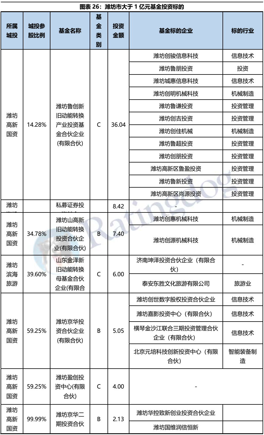 選取青島、濟南以及濰坊進行分析,從基金類型來看,濟南市以C類基金為主,政府參與程度較高,市場化程度偏弱。在投資標的上,上述三城產業基金的主要投向為信息技術、汽車和醫藥領域。