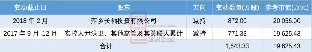 另外,根據上市公司于2018年1月1日披露的股東減持計劃,萍鄉長袖投資有限公司計劃自公告披露之日起15個交易日后不超過6個月內減持其持有的公司股份2484.18萬股,占公司總股本的5.97%。公開信息顯示:該計劃披露之后到目前,其減持股份數量約872萬股,減持計劃尚未實施完畢。