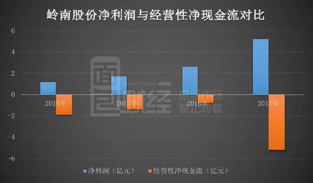 公開數據顯示:2014-2017年,嶺南股份凈利潤合計約10.65億元,經營性現金凈流出約9.25億。2017年,公司經營性凈現金流與凈利潤的背離程度明顯擴大,凈利潤約5.18億元,經營性現金凈流出約5.21億元,兩者相差數額超過10億。