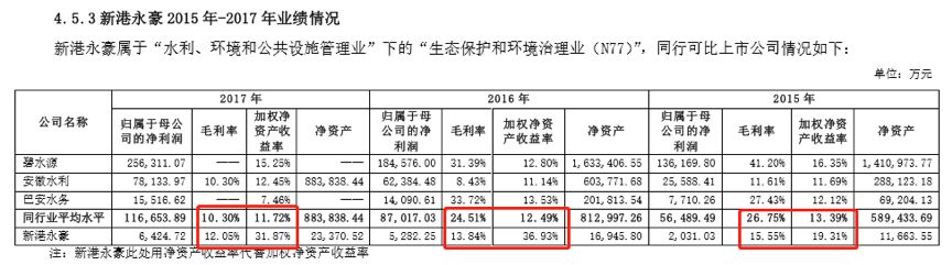 再看看這家公司與同行業相同財務指標的對比情況:2015-2017年,新港永豪ROE分別為19.31%、36.93%及31.87%,同行業平均ROE分別為13.39%、12.49%及11.72%。以下為公開信息中披露的行業對比情況: