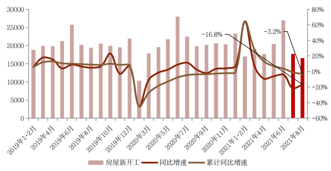 數據顯示,1-8月全國房地產開發投資98060億元,同比增長10.9%,保持基本穩定;新房銷售短期內面臨較大下行壓力,8月單月商品房銷售面積同比下降近16%,東部地區銷售增速出現回落。與此同時,施工和拿地雙雙再度降溫,其中新開工同比降17%至2019年以來月度最低。