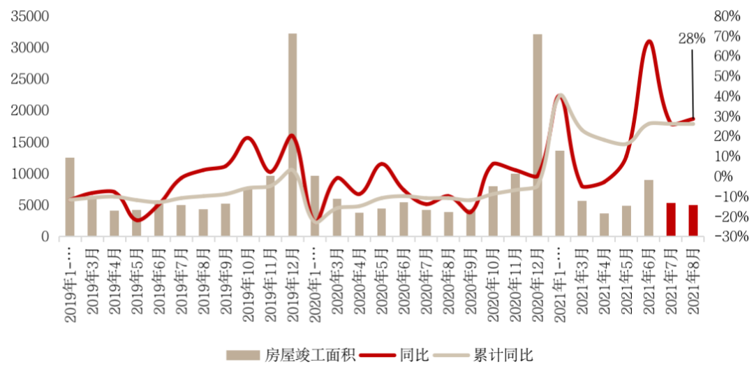8月全國房企房屋竣工面積4957萬平方米,同比增速和累計同比增速雙雙增長至26%和28%。一方面“交付大年”下房企具備剛性壓力,另一方面提速已售項目竣工可盤活預售資金監管賬戶內資金。因此房屋竣工面積持續發力,支撐8月整體投資規模環比小增。