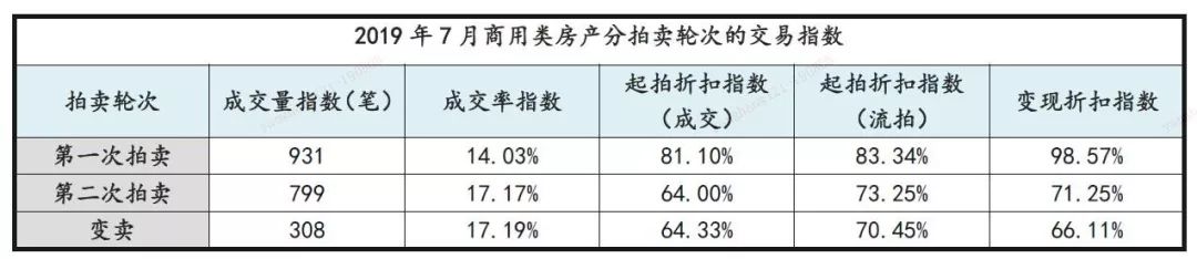 - 趨勢分析:7月商用類房產(chǎn)拍賣市場成交量下降明顯,為2038筆,環(huán)比下降16%,在五月、六月持續(xù)增長后,出現(xiàn)較大幅度的下跌;成交率為15.58%,同上期相比下降三個百分點;起拍折扣指數(shù)為71.86%,變現(xiàn)折扣指數(shù)為82.95%,兩指標(biāo)基本保持穩(wěn)定并有小幅增長。
