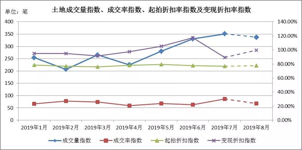- 趨勢分析:7月土地類資產(chǎn)成交量為351筆,連續(xù)第三個月增長,但增速有所放緩,預(yù)測8月將有小幅下降趨勢;成交率為30.09%,較6月大幅上升,增長八個百分點,說明土地資產(chǎn)的流動性有所提升;起拍折扣指數(shù)為76.62%,基本與6月持平;變現(xiàn)折扣指數(shù)為89.32%,出現(xiàn)今年以來首次大幅度下跌,跌破90%,為今年最低點。結(jié)合成交率的大幅增長趨勢分析,在土地交易中投資人占據(jù)主動,賣方為盡快成交降低價格出售資產(chǎn);值得提醒的是,同工業(yè)類房產(chǎn),土地交易的單筆金額大,市場規(guī)模占比較小,稍有波動就會形成比較明顯的交易數(shù)據(jù)。