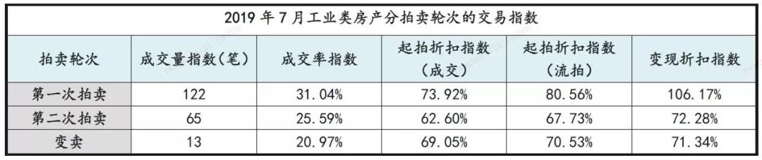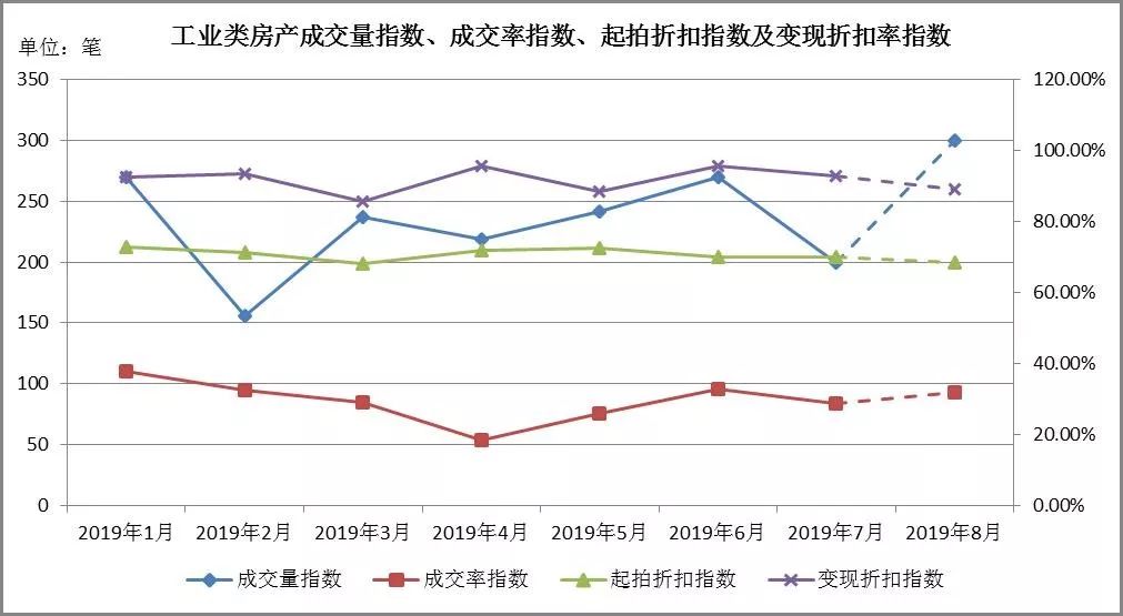 - 趨勢分析:7月工業(yè)類房產(chǎn)成交量200筆,較6月減少70筆,下降幅度較大,工業(yè)類房產(chǎn)因非標(biāo)標(biāo)準(zhǔn)化程度高,單筆金額較大,此類資產(chǎn)所占市場規(guī)模較小,稍有波動就會形成比較顯著的數(shù)據(jù);成交率為28.62%,較6月下降四個百分點;起拍折扣指數(shù)為69.92%,基本保持穩(wěn)定,有小幅下降趨勢;變現(xiàn)折扣指數(shù)為92.89%,較6月下降三個百分點,仍有進(jìn)一步下降的趨勢。