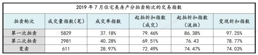 - 趨勢分析:7月住宅類房產(chǎn)拍賣市場成交量小幅降低,成交量9421筆,環(huán)比下降2.9%;成交率本期變化不大,為37.63%,較6月微升;起拍折扣指數(shù)為75.86%,較上月增長3%,變現(xiàn)折扣指數(shù)為89.89%,基本與6月持平。