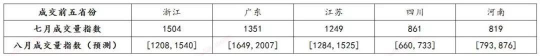 - 趨勢分析:7月在成交量上浙江省穩(wěn)步增長,超越廣東省,排名第一;廣東省成交量出現(xiàn)大幅下降,環(huán)比下降17%;四川省與河南省的成交量都有所增加,四川省增幅較大,超越河南省,躍居第四,市場預(yù)期較好。從成交量走勢來看,浙江省與廣東省波動較為頻繁,特別是廣東省,每月的成交量變化較快。
