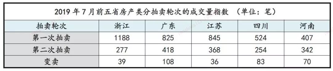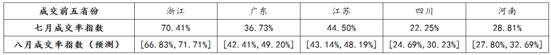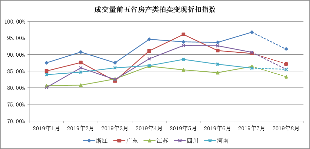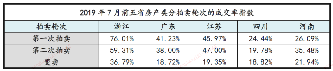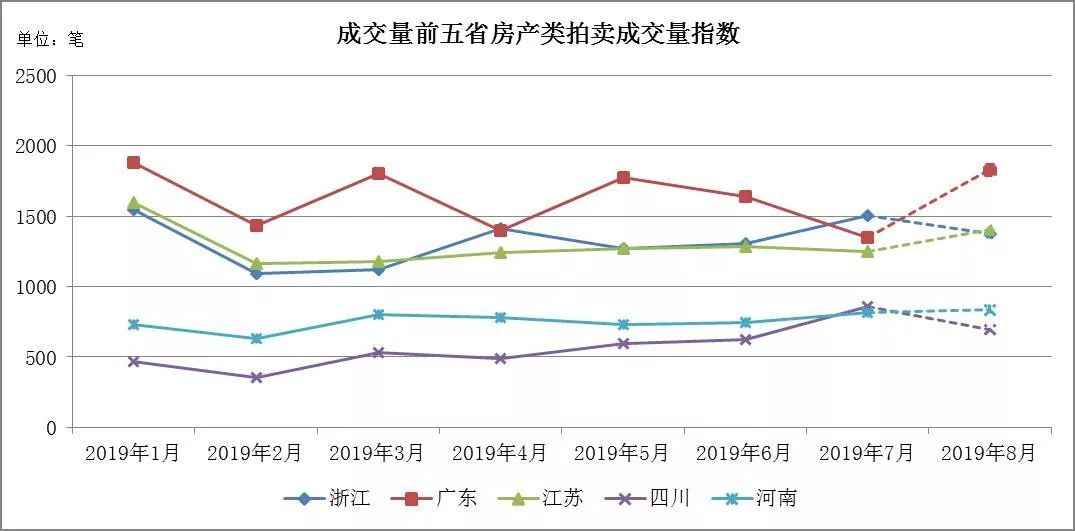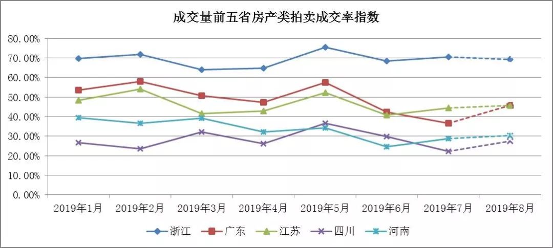 - 趨勢分析:7月的五省成交率變化有所差異,浙江省微升兩個百分點,江蘇省與河南省小幅增加4%,廣東省與四川省的成交率明顯下降。廣東省成交量與成交率雙降,說明市場處于低迷狀態(tài),交易難度提升;四川省的成交量增加但成交率仍在下降,說明市場四川省的資產(chǎn)量多投資人相對較少,呈現(xiàn)明顯的買方市場。