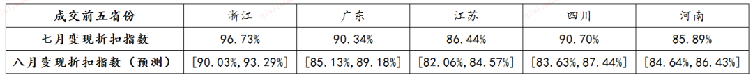 - 趨勢分析:7月浙江省、江蘇省變現(xiàn)折扣指數(shù)增幅較大,另三省呈下降趨勢。其中,浙江省的增幅最大,較6月增長3%,江蘇省在連續(xù)兩個月的下降后,7月變現(xiàn)折扣指數(shù)有所提升。整體來看,未來五省的變現(xiàn)折扣指數(shù)預(yù)期呈下降趨勢。